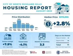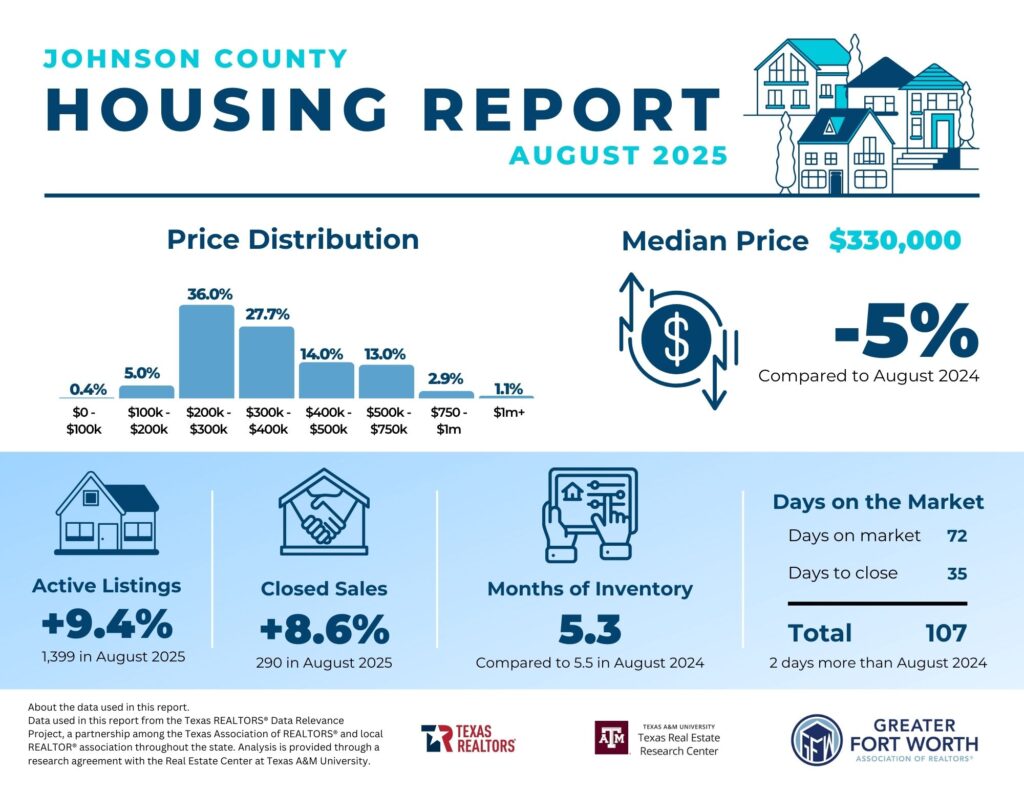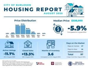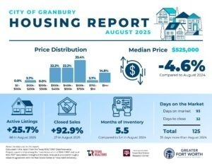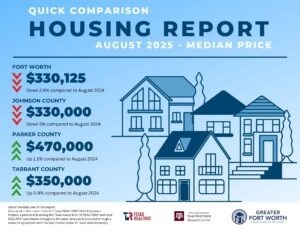 The Housing Report for August 2025 shows the Greater Fort Worth Area, and surrounding Counties continue to move toward a more balanced market as inventory slowly creeps up.
