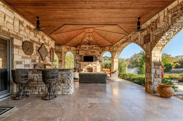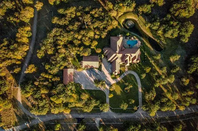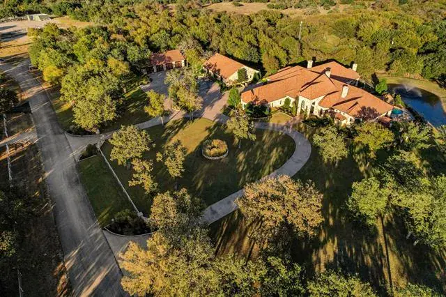 Tucked quietly behind the curve of Kelly Road, River Ranch Road is one of Aledo’s best-kept secrets – a “if you know, you know” enclave of only 13 estate-like residences that lead back to the Clear Fork of the Trinity. Beyond the understated entrance towards the end of the road lies a property that perfectly balances privacy, scale, and sophistication. Set on just over 9 acres, this single story 6,996-square-foot main residence was built in 2013 and captures timeless Texas elegance, with a sparkling pool, large pond with a fountain, surrounded by mature trees, teeming with wildlife and mature whitetail deer. Inside, the expansive living space boast 4 bedrooms, an office, 2 living rooms, a sitting room, a bonus room, and it all flows seamlessly outside to over 2,000 square feet of covered back patios, framed by graceful stone arches that overlook fantastic pool and outdoor entertaining area, ideal for both quiet mornings and lively gatherings. A detached four-car garage and a standalone gym add flexibility and room to grow the already impressive property’s footprint. The gym has ample space and could easily be reimagined as a guest house or secondary residence, offering endless possibilities for multigenerational living, work, or leisure. This is a rare opportunity to own one of Aledo’s most exclusive addresses where every detail, from the setting to the craftsmanship, is designed for those who value space, privacy, and understated luxury. Located just 5 minutes from BlueJack Ranch and 10 minutes to town.