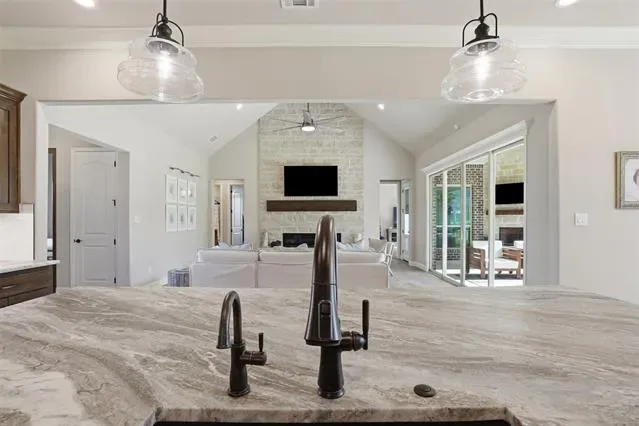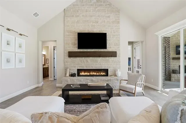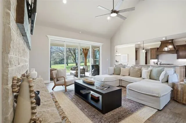Step inside to a bright and open floor plan designed for both everyday living and entertaining. The spacious living room features a soaring cathedral ceiling, a full stone linear gas fireplace, and large sliding glass doors that flood the space with natural light while showcasing scenic countryside views.
