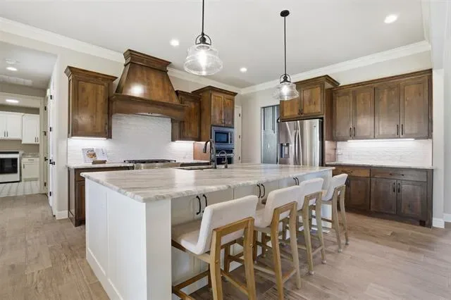 The chef’s kitchen offers beautiful cabinetry, ample storage, a walk in pantry, and an oversized island perfect for gathering with family and friends. The open layout flows seamlessly into the living and dining areas creating an ideal space for hosting and everyday living.