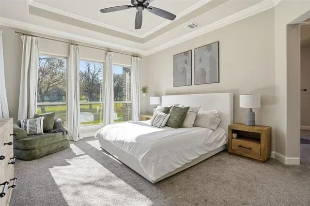 The private primary suite is a true retreat featuring a tray ceiling, abundant natural light, and convenient access to the laundry room. The spa like bath includes a freestanding soaking tub, walk in shower, dual vanities, and a large walk in closet.