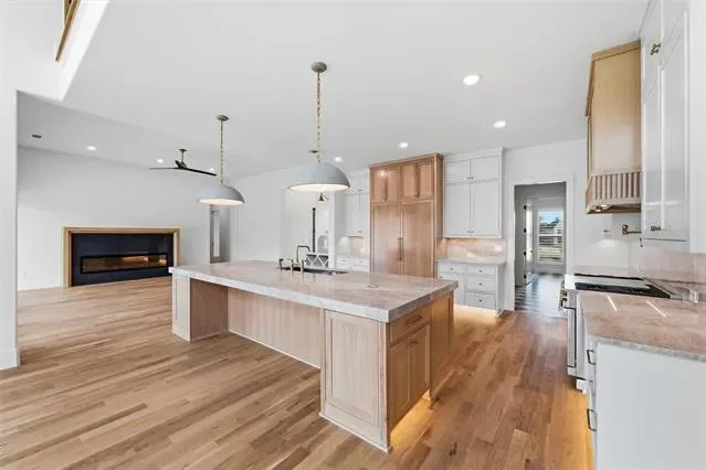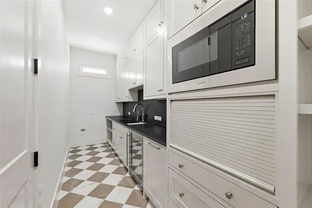 The chef’s kitchen showcases GE Monogram appliances, including a 48-inch dual-fuel professional range, built-in refrigerator and freezer, and a Ruvati workstation sink. A large island features pop-up outlets and charging stations, while the adjoining scullery or prep kitchen provides additional prep space and convenient garage access for easy unloading.
