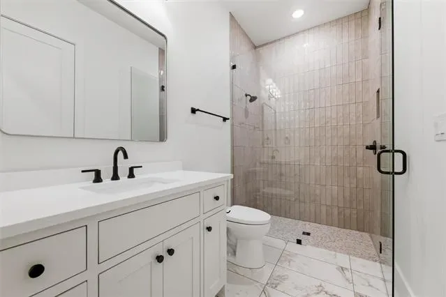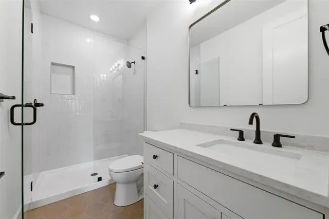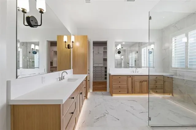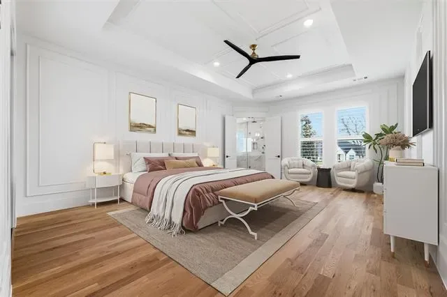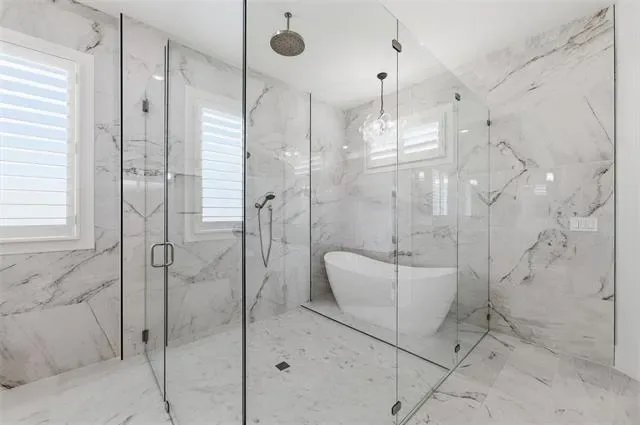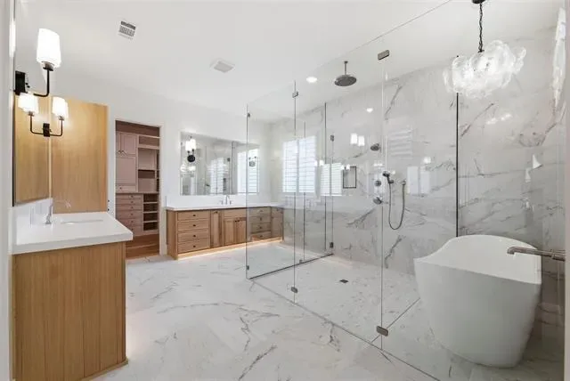 The primary suite offers a private retreat with patio access and a spa-inspired bath featuring a custom walk-in closet and striking wet room design with soaking tub inside a glass-enclosed shower.