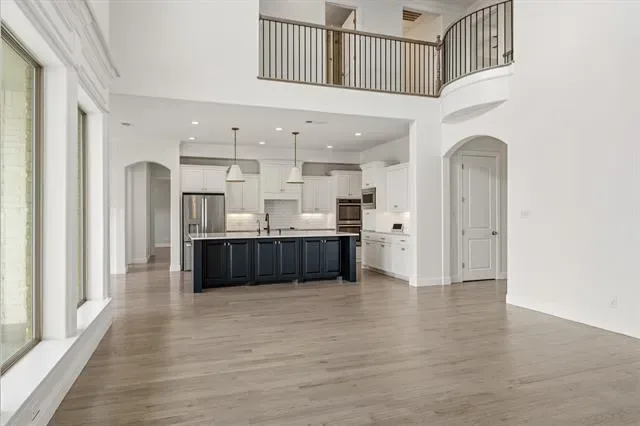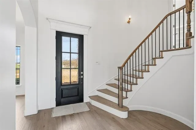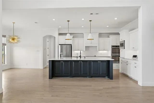 Welcome to refined Texas living in the gated community of Claire Vista and Bear Country Estates, located in the highly sought-after Aledo ISD. Situated on a fully fenced 1.4-acre lot, this spacious property offers room to spread out, entertain, and enjoy peaceful outdoor living while still being close to everyday conveniences. Step inside to a light-filled entry featuring a stunning curved staircase, custom stained oak hardwood floors, and elegant decorative lighting. The open layout is designed for both comfort and connection, with generous living spaces perfect for gathering with family or hosting friends. The chef-inspired kitchen includes an oversized island, stainless steel appliances, a butler’s pantry with beverage fridge, and a large walk-in pantry—making meal prep and entertaining easy. This home also offers smart home features, allowing you to manage lighting, temperature, security, and more from your phone or tablet. Smart homes provide convenience, improved energy efficiency, and peace of mind for today’s busy households. And a whole home GENERAC. The thoughtful floor plan places the primary suite and a guest bedroom on the main level, while two additional bedrooms, a game room, and media room upstairs provide space for relaxation and fun. A dedicated home office offers flexibility and could easily serve as a fifth bedroom. Step outside to your backyard oasis featuring a sparkling in ground Gunite pool, gentle evening breezes, and beautiful late-day shade—perfect for family time, outdoor dining, or relaxing under the glow of string lights.