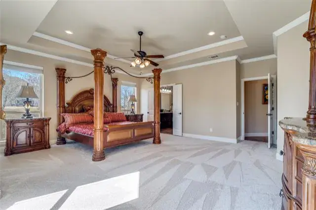 The chef-inspired kitchen is the heart of the home, boasting granite countertops, custom knotty alder cabinetry, a pot filler, and a suite of high-end stainless-steel appliances including double ovens. The eat in kitchen has a domed ceiling and the dining room has a rough textured vaulted ceiling for the best eating atmosphere. The living area is highlighted by soaring ceilings and a floor-to-ceiling stone gas log fireplace