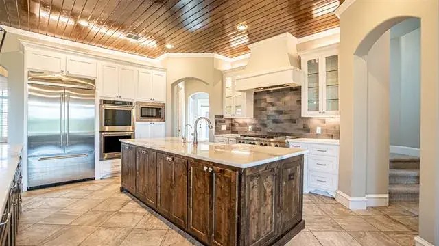 The kitchen features a massive quartz island, professional-grade stainless steel appliances, double ovens, custom cabinetry, and a walk-in pantry. A formal dining room and generous breakfast nook provide flexible gathering spaces.