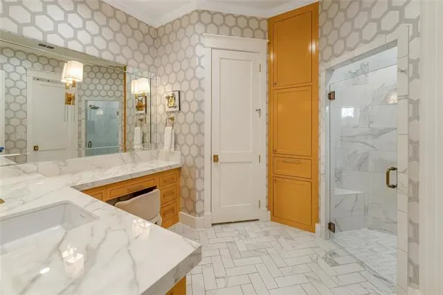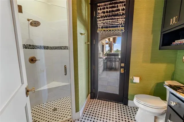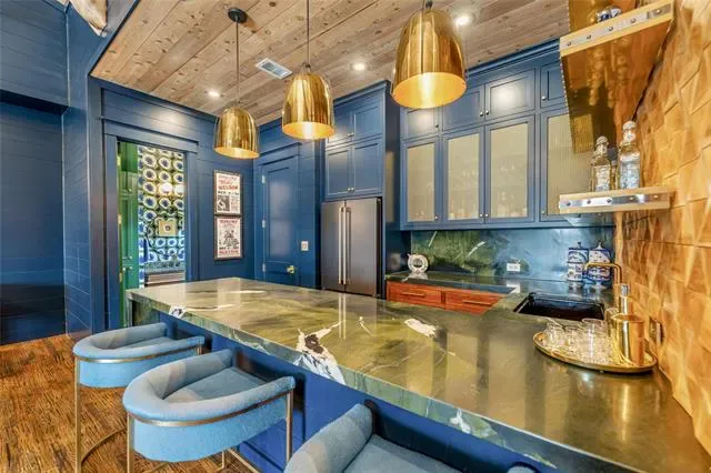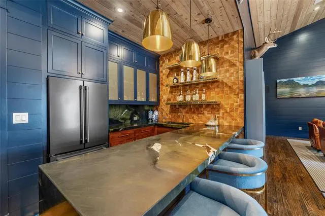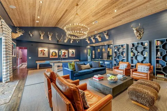 Built for entertaining, the expansive game and family room features a spectacular wet bar complete with custom brass shelving, True refrigeration, wine coolers, commercial bottle coolers, and multiple ice machines. A whole-home Sonos sound system carries music seamlessly throughout the interior and outdoor spaces.