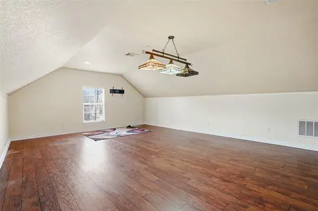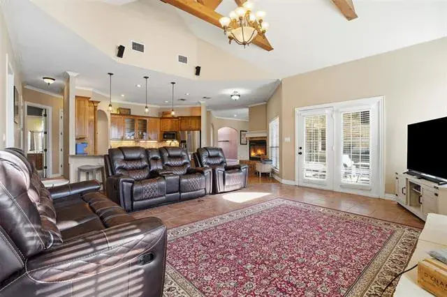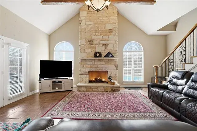Inside, the home features four bedrooms, three full baths, and three distinct living areas including a versatile bonus room above the garage ideal for a game room, media room, craft or exercise space. The main family living space is open to the kitchen and anchored by a dramatic vaulted ceiling with exposed beams, floor to ceiling stone fireplace all creating an open and inviting atmosphere filled with natural light.
