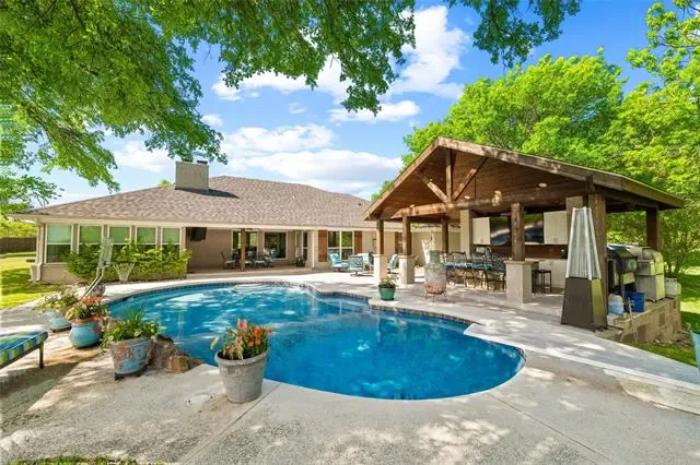 Rare opportunity to own a fully equipped Aledo retreat on 8.673 AG-exempt acres. This private, gated estate is perfectly tailored for the equestrian lifestyle, featuring full fencing and cross-fencing, two horse stalls, and a dedicated tack room within a generous barn that includes ample space for a workshop or equipment storage. The 4-bedroom, 3.5-bath home has been beautifully updated to offer 3,680 sq. ft. of functional country elegance. After a day on the land, unwind in the exceptional outdoor living area, featuring a pool, hot tub, and a professional-grade outdoor kitchen. From the scenic valley vistas to the mature timber throughout the property, every inch of this estate offers peace and privacy. Additional perks include a Tonal-equipped workout room and batting cage—. Aledo ISD
