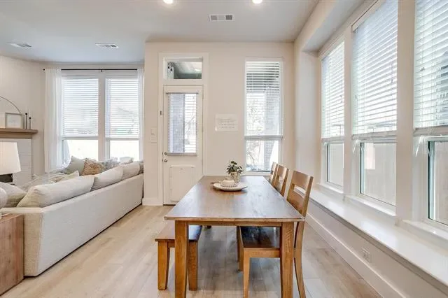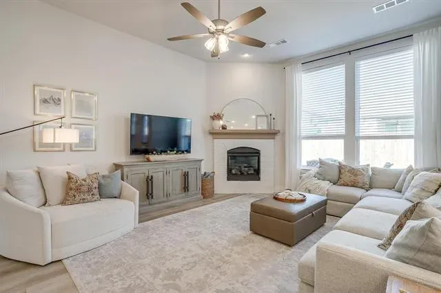 The kitchen is designed for actual use: oversized quartz island, white shaker cabinets, and built-in stainless appliances. Blonde luxury vinyl plank flooring runs throughout, paired with a gray brick exterior and a brick gas log fireplace that anchors the living space. Floor-to-ceiling windows bring in natural light without sacrificing proportion.