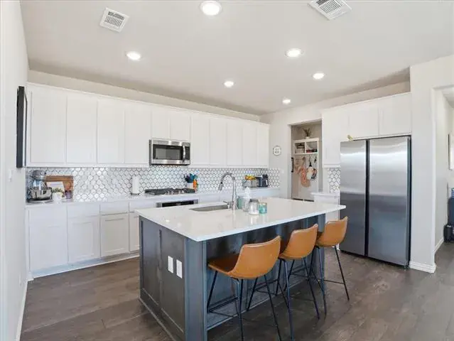 This thoughtfully planned two-story home offers a layout that supports real day-to-day living, with an open kitchen, dining, and main living area that feels connected and functional. The kitchen anchors the space with generous counter space, ample storage, and room to gather, while the adjacent living and dining areas provide flexibility for both everyday use and entertaining.