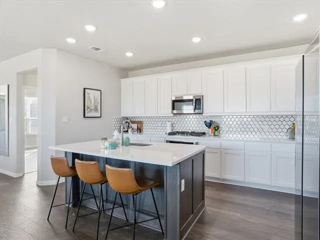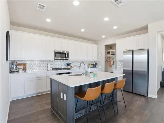 This thoughtfully planned two-story home offers a layout that supports real day-to-day living, with an open kitchen, dining, and main living area that feels connected and functional. The kitchen anchors the space with generous counter space, ample storage, and room to gather, while the adjacent living and dining areas provide flexibility for both everyday use and entertaining.