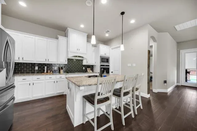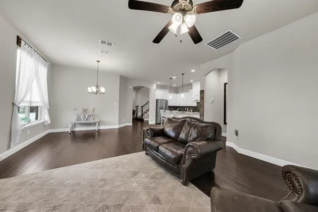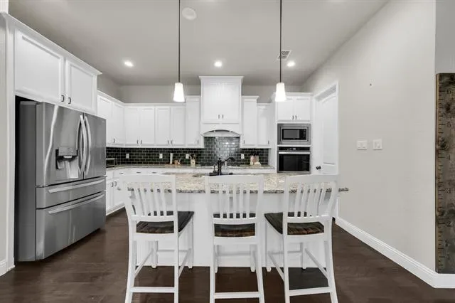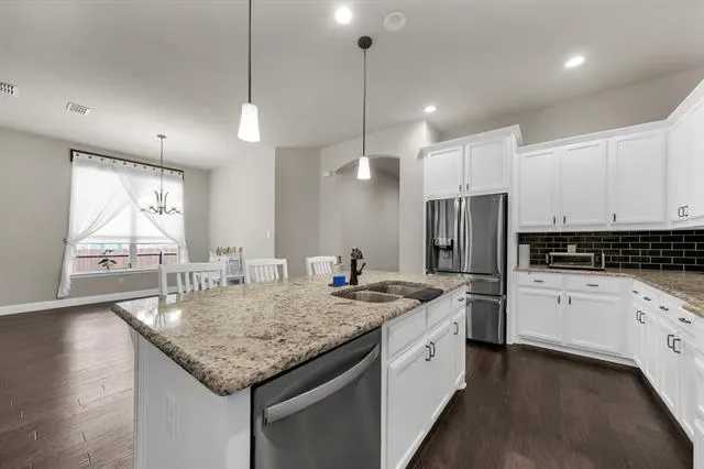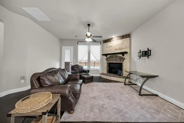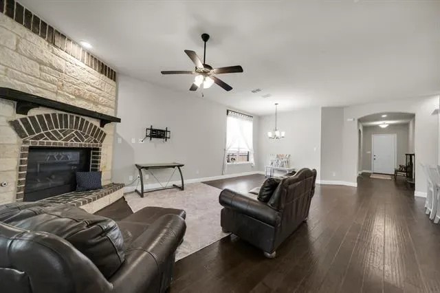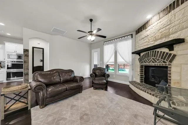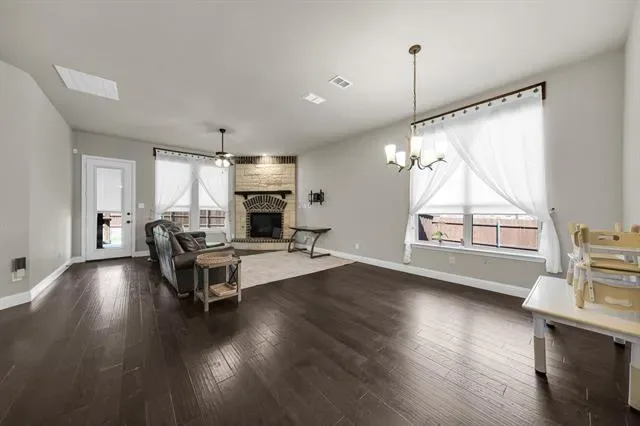 Rendition-built 4 bedroom, 3 bath home in Morningstar with hardwood floors, a floor-to-ceiling brick fireplace, and an open kitchen centered around a granite island that actually works for everyday life. The primary suite feels tucked away and includes a spa-like ensuite plus a connected office or flex space…whatever fits your setup. Out back, you’ve got a fenced yard with an extended patio, pergola, and a storage shed that saves you from cramming everything into the garage. Speaking of the garage, epoxy-coated floors and Jellyfish lighting on the exterior add a nice extra touch. Morningstar brings strong amenities, including the new McKinney Elementary, and the location makes it easy to settle in and stay awhile.