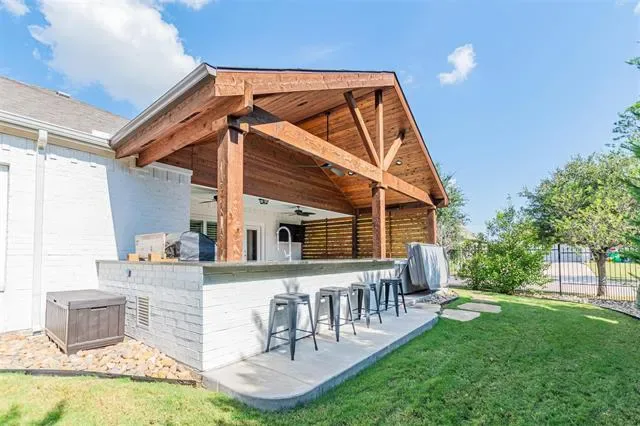Located in the highly sought-after Parks of Aledo community in Aledo, TX, this beautifully upgraded home offers a versatile layout and exceptional indoor-outdoor living. The open-concept floor plan seamlessly connects the main living area to a gourmet kitchen featuring a gas cooktop, oversized island, stylish cabinetry, and ample prep space — ideal for entertaining and everyday living. A rare and desirable feature, this home includes two primary suites, providing flexible options for guests or multi-generational living. A dedicated front-facing office creates a private work-from-home space. The covered back patio is designed for year-round enjoyment with a built-in outdoor kitchen, ceiling fans, ambient lighting, and a hot tub, creating a seamless indoor-outdoor flow. The backyard offers added privacy and extended entertaining space.