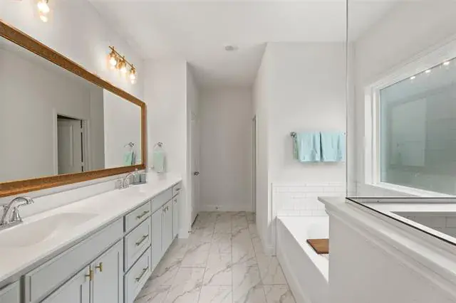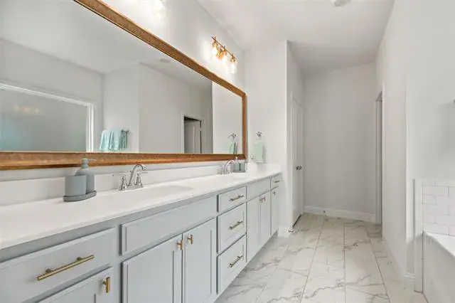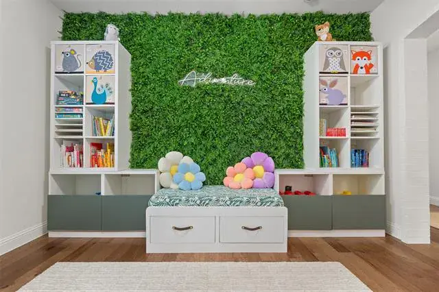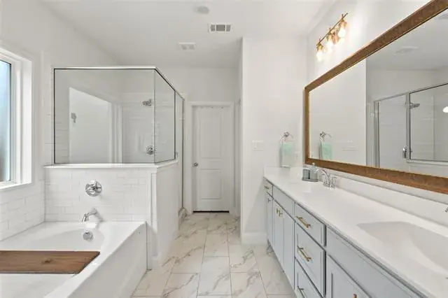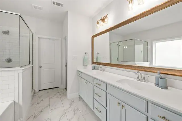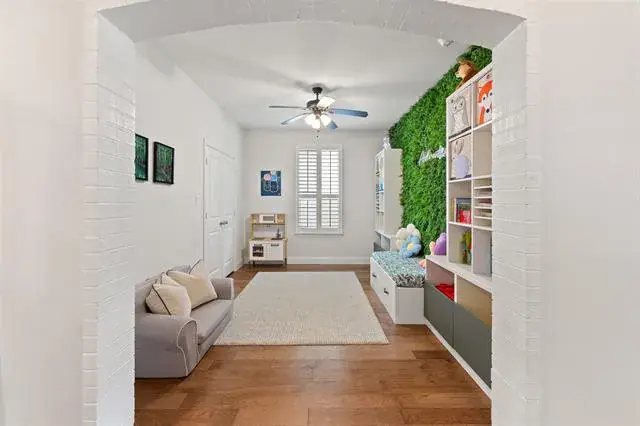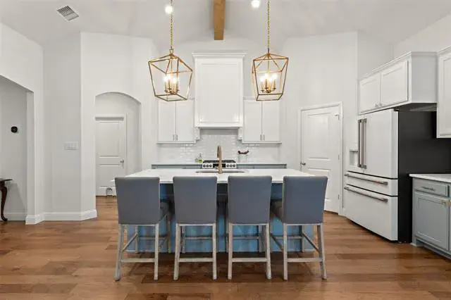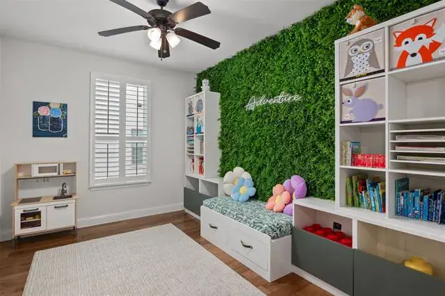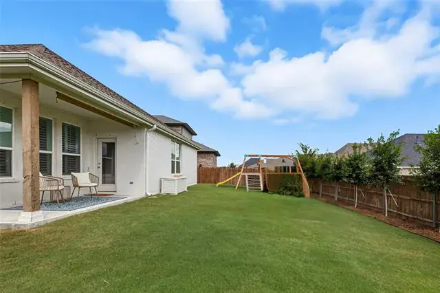 Nestled in the serene Parks of Aledo Point Vista, this stunning Tudor transitional home boasts exceptional curb appeal and a welcoming covered front porch. Beautiful landscaping leads to a striking entry, where luxury hardwood flooring, plantation shutters, and elegant decorative lighting set the tone. The versatile floor plan is perfect for entertaining, with an open-concept kitchen, living, and dining area. The stylish eat-in kitchen is a chef’s dream, featuring an oversized island with a breakfast bar, quartz countertops, a spacious pantry, and upgraded appliances and hardware. The living room showcases a gas fireplace with a brick surround, hearth, and mantel, while vaulted ceilings with a trimmed beam add character. The dining room overlooks the fenced backyard with a covered patio, ideal for outdoor enjoyment. The first-floor primary suite is a private retreat, offering a spa-like en-suite bath with double vanities, a large soaking tub, a separate shower, and an expansive walk-in closet. A secondary bedroom and full bath are also conveniently located downstairs along with a flex space that could be an office or additional living room. The spacious laundry room is thoughtfully designed with ample storage and room for a second refrigerator. A built-in drop zone with lockers provides organization just inside the garage entry, which also features epoxy flooring and additional storage. Upstairs, you’ll find two additional bedrooms, a full bathroom, a second living area, and a flexible office or bonus space. The Parks of Aledo community offers over 12 miles of scenic hiking and biking trails, a disc golf course, playgrounds, dog parks, and community gardens providing something for everyone in a peaceful, park-like setting.