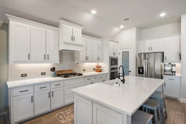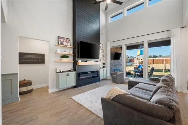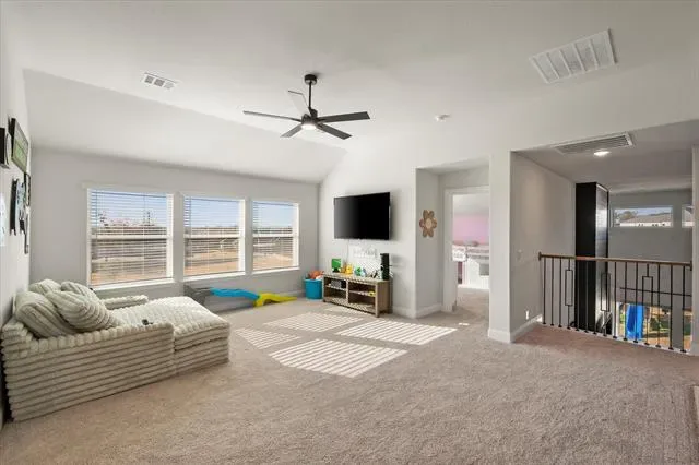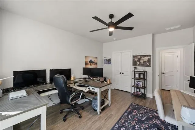 This multi-generational home sits on a large .25-acre corner lot and features two primary suites with walk-in closets, a Jack-and-Jill bath with dual rainhead shower, a gameroom, a separate office, and a bonus room that can be used as a sixth bedroom. The kitchen offers two walk-in pantries, a ceramic farmhouse sink, and quartz countertops, while the family room boasts large windows with motorized shades. The home also includes a custom treated wood swingset, included as a bonus, and an extended garage.