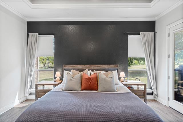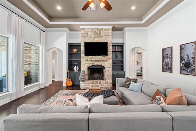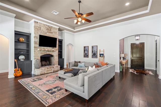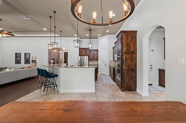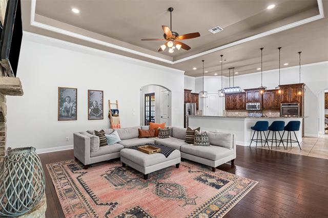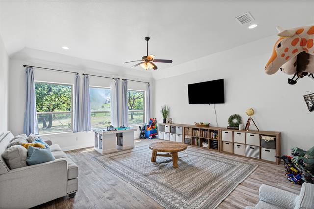 Set on a beautiful one-acre lot, this Aledo ISD home offers space, privacy, and modern comfort with four bedrooms plus a dedicated office and a versatile game room. The expansive kitchen serves as the heart of the home, featuring abundant counter space, a large island, ample cabinetry and storage, and a seamless flow into the dining and main living areas, creating the perfect layout for entertaining family and friends. The open-concept design allows gatherings to move easily from the kitchen to the spacious living room, where high ceilings and natural light enhance the inviting atmosphere and showcase the stunning stone fireplace surrounded by gorgeous built ins. The primary suite is a true retreat, offering an island soaking tub, a dual-entry shower with a combining waterfall feature, and elegant finishes throughout. Recent updates include faux wood flooring in the primary bedroom and playroom (2022), new interior paint from 2020–2025, freshly painted built-ins and doors, and a new epoxy-coated garage floor with anti-slip finish (2023). Additional improvements include a completed backyard fence with two access gates installed, gutters, and sprinkler system, a new AC unit for the main living and bedroom areas (2023-2024) with a new indoor motor (2025), a water softener system, and a newer dishwasher. Enjoy the benefits of private well, along with an oversized laundry room and an impressive primary closet. With thoughtful upgrades inside and out, this beautifully maintained property combines efficiency, style, and the peaceful charm of country living—all within minutes of top-rated Aledo schools.