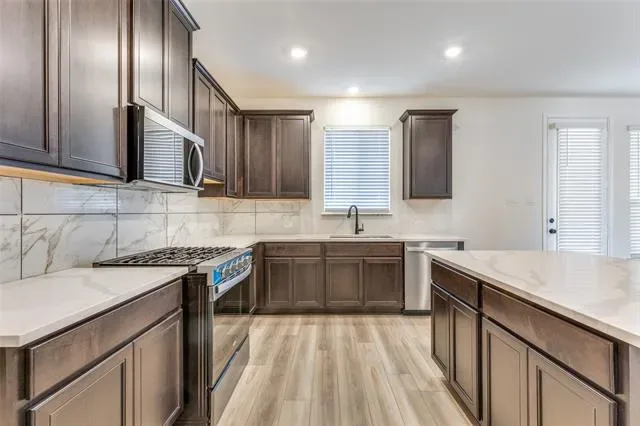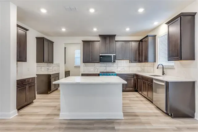 Discover modern living in this two-story home featuring an open concept kitchen and living area. The upgraded kitchen boasts Quartz countertops, a breakfast bar, and stainless steel appliances. Retreat to the primary bathroom with raised cabinets and a fiberglass shower with a clear enclosure. Step outside to enjoy the front porch and extended covered patio. Appreciate the decorative touches like stained entry doors, wood cabinets, vinyl windows, and smart home features throughout. This home offers comfort and style with a game room, fifth bedroom, and modern amenities like USB ports and a smart thermostat. Ask sales counselor about closing cost and rate buy down opportunities.