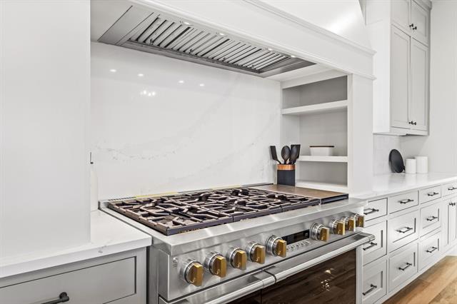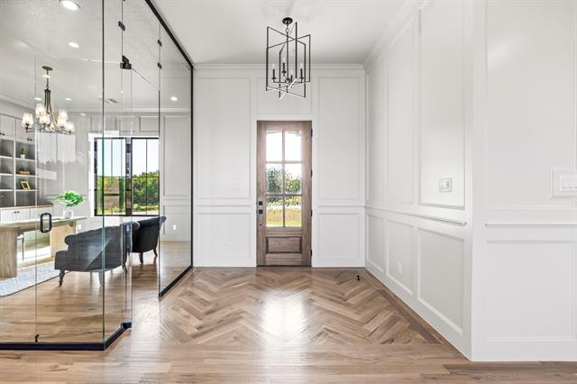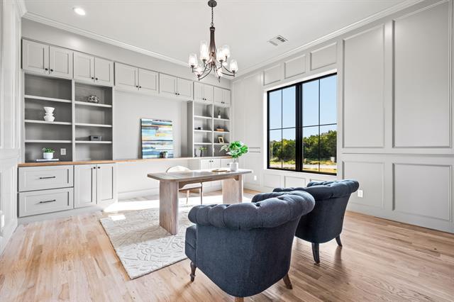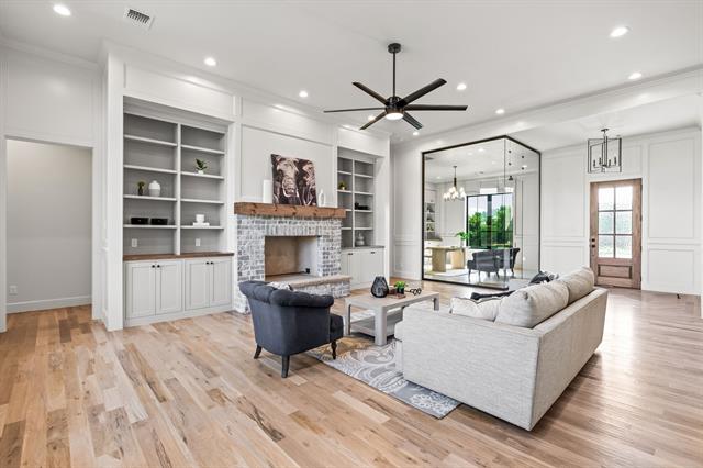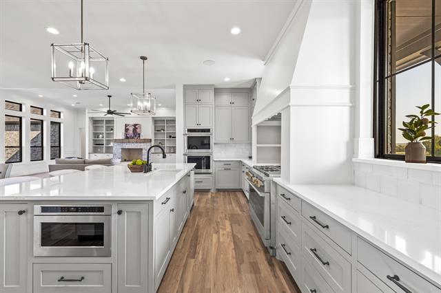 Built by Fourlight Custom Homes, this 4-bed, 4.5-bath residence blends artistry and comfort in every detail. From the moment you arrive, upgraded brick and stone, Hardie siding, and cedar porch ceilings set a welcoming, timeless tone. Inside, hand-scraped wood floors and soaring floor-to-ceiling Andersen windows pair with a high-efficiency Lennox system and spray-foam insulation to create a home that’s as energy-smart as it is beautiful. The grand living room, crowned with 12-foot ceilings and a wood-burning (gas-assist) fireplace, invites gatherings of every size. Sunlight pours through the windows and flows into the dining area and chef’s kitchen, where a Thermador built-in refrigerator and freezer, quartz countertops, soft-close cabinetry, and an expansive island inspire both quiet mornings and lively dinner parties. Behind it, a walk-in and butler’s pantry offer abundant countertop space and built-in cabinet storage galore, keeping everything organized and out of sight so the main kitchen stays pristine. A glass-walled study with custom built-ins provides a serene spot for work or reading, while a game room with dry bar and media space sets the stage for fun. Throughout the home, pre-wired sound and data drops mean you’re ready for today’s tech and tomorrow’s upgrades. The private primary suite is a true retreat, with spa-style bath featuring quartz counters, a steam shower with rain head and body sprays, a freestanding soaking tub, and a custom walk-in closet. Each secondary bedroom enjoys its own ensuite bath, ensuring comfort and privacy for family or guests. Step outside to a large covered patio with cedar ceilings, wood-burning (gas-assist) fireplace, and a built-in grill—perfect for year-round entertaining or quiet evenings under the stars. A water-softener system and three-car garage add everyday ease. Make this gem your new home today!