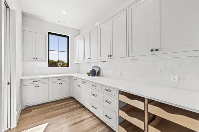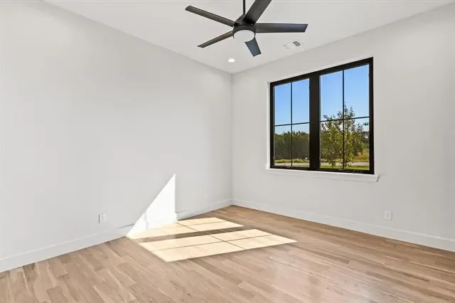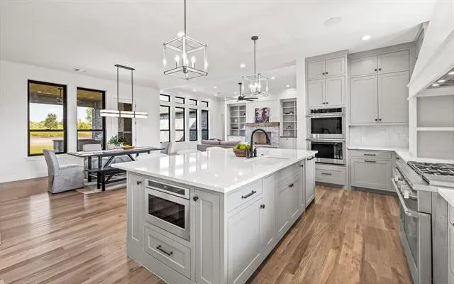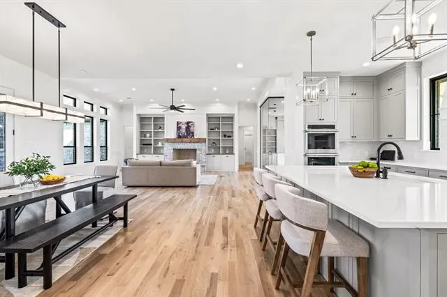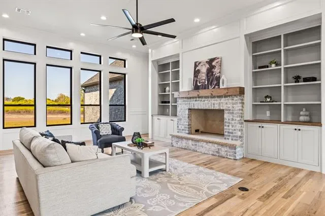 Built by Fourlight Custom Homes, this 4-bed, 4.5-bath residence blends artistry and comfort in every detail. From the moment you arrive, upgraded brick and stone, Hardie siding, and cedar porch ceilings set a welcoming, timeless tone. Inside, hand-scraped wood floors and soaring floor-to-ceiling Andersen windows pair with a high-efficiency Lennox system and spray-foam insulation to create a home that’s as energy-smart as it is beautiful. The grand living room, crowned with 12-foot ceilings and a wood-burning (gas-assist) fireplace, invites gatherings of every size. Sunlight pours through the windows and flows into the dining area and chef’s kitchen, where a Thermador built-in refrigerator and freezer, quartz countertops, soft-close cabinetry, and an expansive island inspire both quiet mornings and lively dinner parties. Behind it, a walk-in and butler’s pantry offer abundant countertop space and built-in cabinet storage galore, keeping everything organized and out of sight so the main kitchen stays pristine. A glass-walled study with custom built-ins provides a serene spot for work or reading, while a game room with dry bar and media space sets the stage for fun. Throughout the home, pre-wired sound and data drops mean you’re ready for today’s tech and tomorrow’s upgrades. The private primary suite is a true retreat, with spa-style bath featuring quartz counters, a steam shower with rain head and body sprays, a freestanding soaking tub, and a custom walk-in closet. Each secondary bedroom enjoys its own ensuite bath, ensuring comfort and privacy for family or guests. Step outside to a large covered patio with cedar ceilings, wood-burning (gas-assist) fireplace, and a built-in grill—perfect for year-round entertaining or quiet evenings under the stars. A water-softener system and three-car garage add everyday ease. Make this gem your new home today!