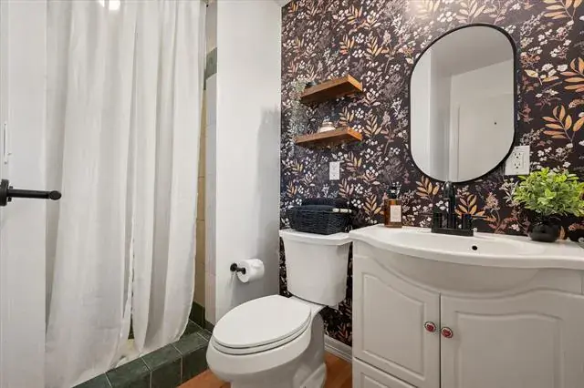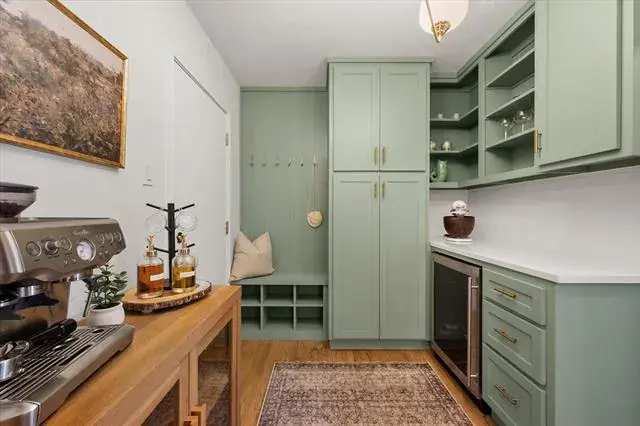 A standout renovation includes a dedicated mudroom and butler’s pantry, also featuring custom cabinetry, open shelving, and a built-in drink refrigerator. This space offers exceptional functionality for daily organization, hosting, and additional prep and storage.