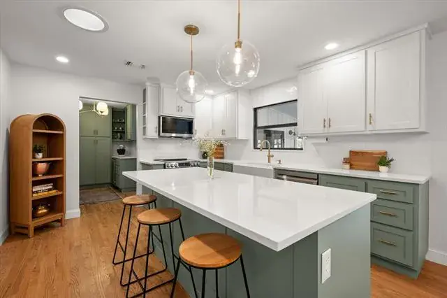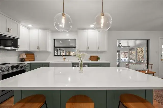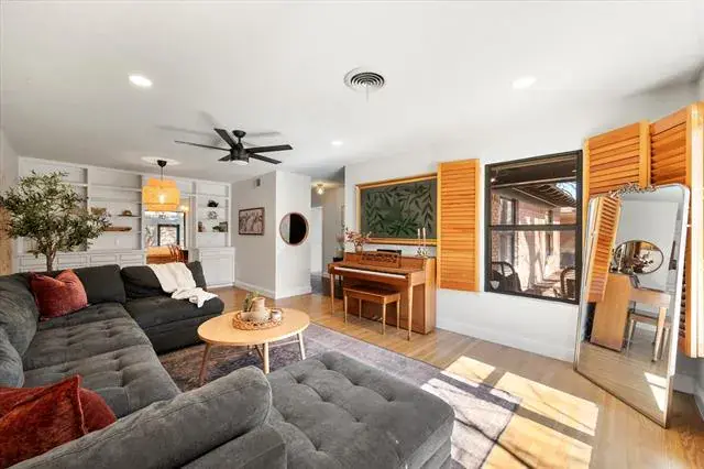 Hardwood floors run throughout, creating a warm and cohesive feel across multiple living areas. The main living room is filled with natural light and flows seamlessly into the dining and kitchen spaces. The updated kitchen features custom-built cabinetry, a large island, generous storage, an electric range with gas capability, and an eat-in layout ideal for everyday living and entertaining.
