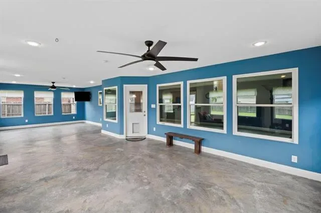 Step outside to a standout extended enclosed patio-sunroom with ceiling fans, ideal for relaxing, a home gym, playroom, or entertaining year-round, all overlooking a large backyard.