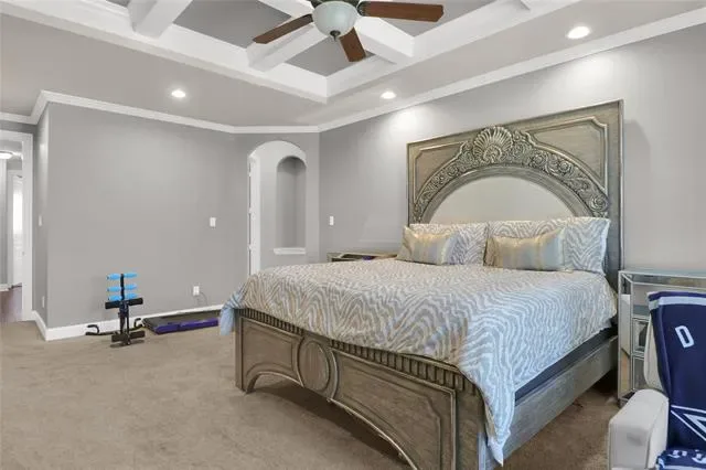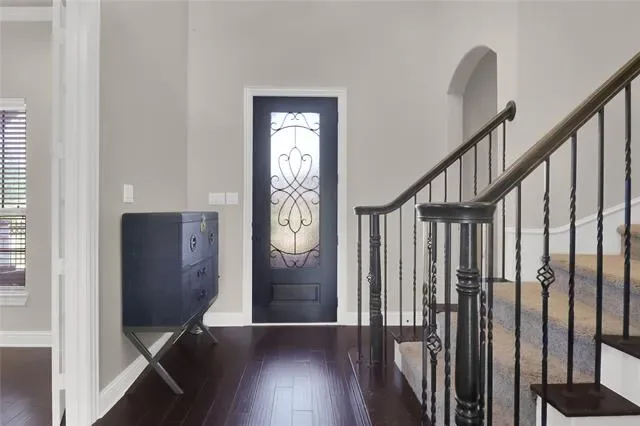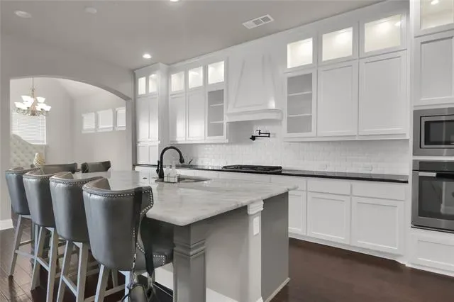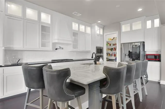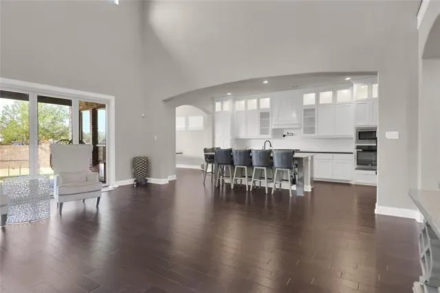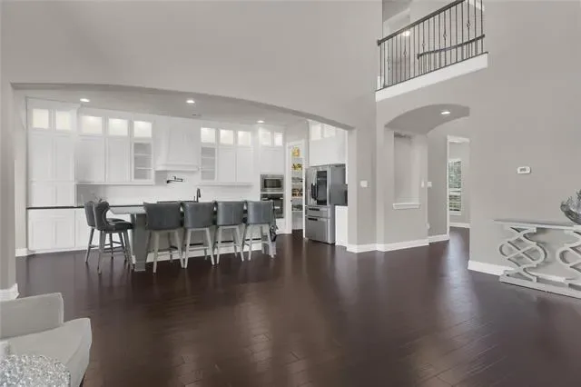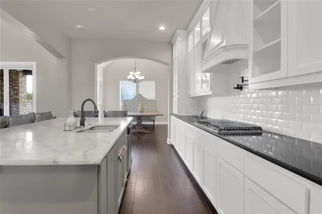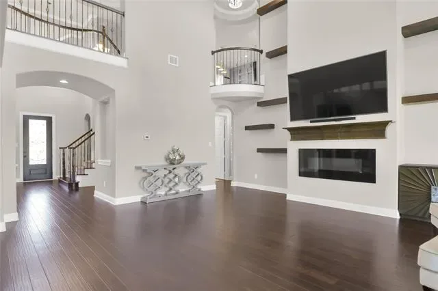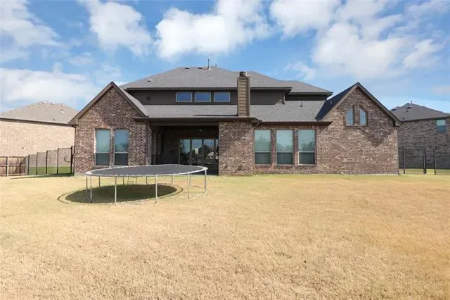 his exquisite custom home by John Houston, referred to as the Carter Floor Plan, is situated within a gated community. It comprises 4 bedrooms, 3.5 bathrooms, a home office, and a mud room. The kitchen, living room, and dining area are arranged in an open floor plan, featuring impressive 24-foot ceilings in the living room. The kitchen serves as a culinary enthusiast’s dream, complete with a level island and breakfast bar, a pot filler, and a gas cooktop. The living room is enhanced by an electric fireplace and bi-fold doors that lead to the outdoor patio, creating an ideal environment for entertaining. The master suite is spacious and overlooks the backyard. The master bathroom is equipped with a luxurious soaking tub, dual vanities, a walk-in closet, and a generous shower. The second bedroom, located on the ground floor, has its own private entry and a full bathroom conveniently located nearby, making it suitable for a mother-in-law suite or a teenage child. The covered patio is equipped with a ceiling fan for cooling and a brick gas fireplace for warmth. On the upper level, there is a game room, a media room with a half bath, and two additional bedrooms that share a full bathroom.