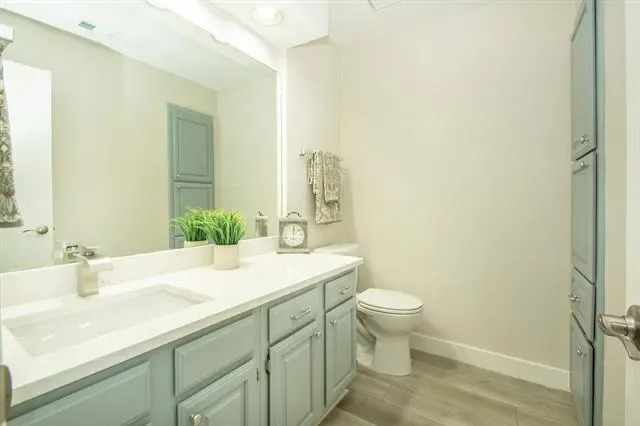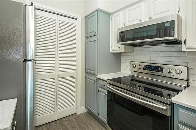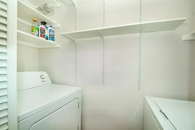Condo is freshly painted with quartz countertops in kitchen and bathrooms. COLOR OF ALL CABINETS IS GRAY. They are appearing green in photos. Stylish vinyl plank in main living areas with carpet in bedrooms. Refrigerator and washer dryer included. You will be ready for hot summer days with 2 BEAUTIFUL POOLS in complex – and view of one from bedroom window. Owners have lovingly cared for property with new air handler installed in 2022, insulation added in attic, and cleaning of air ducts in 2023.