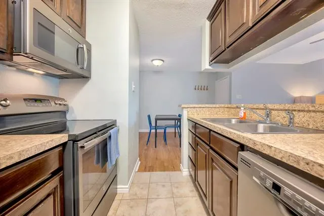 Enjoy modern ease and style in this beautifully updated Arlington condo. Memorable finishes greet you from the moment you step inside. The open living area flows across waterproof vinyl plank flooring, offering a sleek look that is both durable and easy to maintain. The kitchen shines with top of the line appliances. The full bath continues the refinement with quartz surfaces that elevate the everyday. Well maintained home, a modern and inviting atmosphere. Within this secure, gated community, amenities enhance your lifestyle. Relax beside one of three resort-style pools, unwind in the sauna, work out in the fitness center, play tennis, or gather with friends in the clubhouse. All of this is within walking distance of AT&T Stadium and just minutes from Six Flags and a wide variety of shopping and dining options. This condo blends convenience, modern updates, and community living into a seamless package. Schedule your showing today and experience it for yourself.