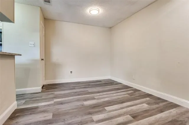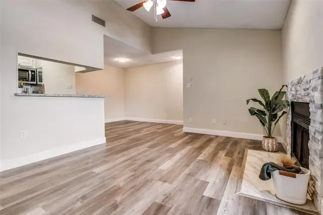 Awesome location in the Cloisters Condominiums of North Arlington. Updated second floor unit ensures no noisy neighbors above you. Kitchen has stainless steel appliances, quartz countertops, electric range, microwave and refrigerator. Extensive wood like flooring and NO CARPET! The updated kitchen is open to living with brick fireplace. Bedroom has two windows and walk-in closet. Bath offers dual sinks and updated tile tub-shower combo. The amenities in the Cloisters include tennis-pickleball courts, recreation center with table games, racquetball courts. Clubhouse, multiple pools, fitness room, sauna. Location is within walking distance to ATT Stadium, Choctaw stadium, Globe Life Park, Texas Live, with dining and shopping. No FHA or VA financing.