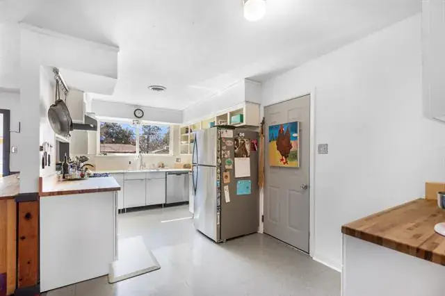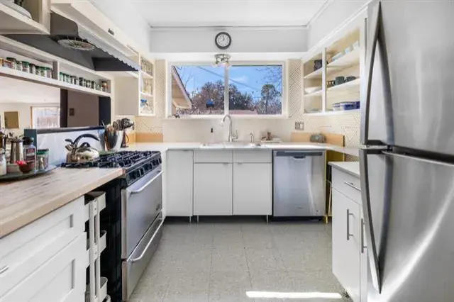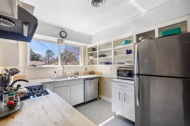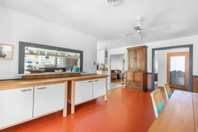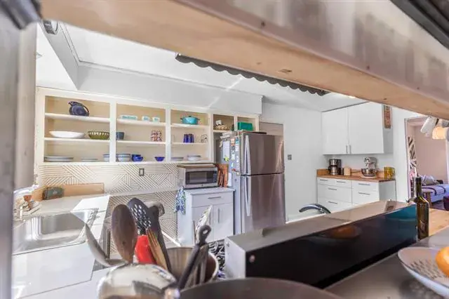 The kitchen offers open shelving, generous cabinetry, and a large picture window overlooking the backyard, filling the space with light and greenery. The adjacent dining area includes a convenient breakfast bar with direct kitchen pass-through—perfect for easy hosting.