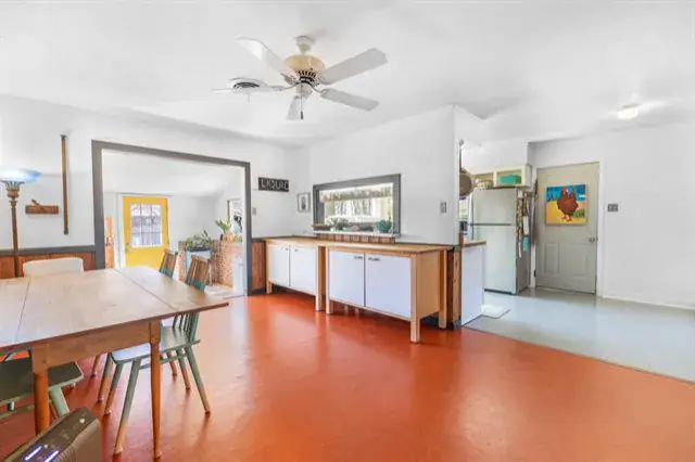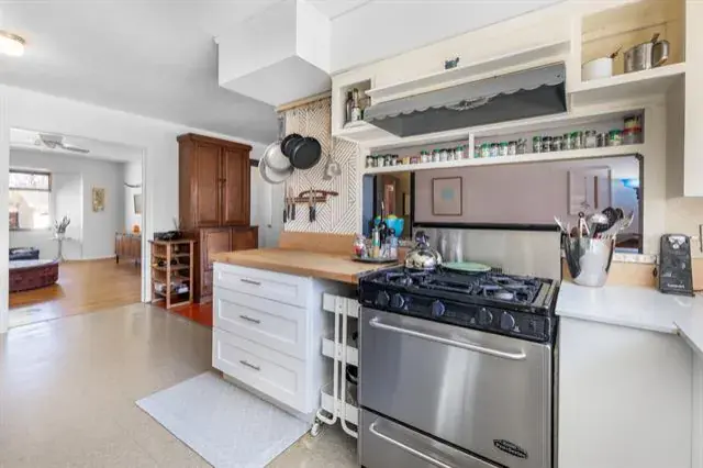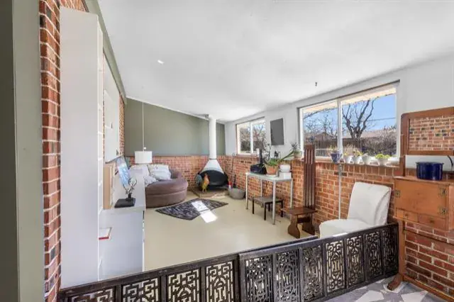 A secondary living area highlights exposed brick walls, built-in shelving, and a freestanding 1950s vintage fireplace, creating a cozy yet distinctive retreat.