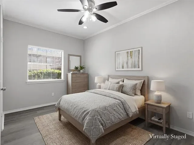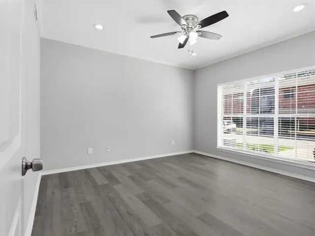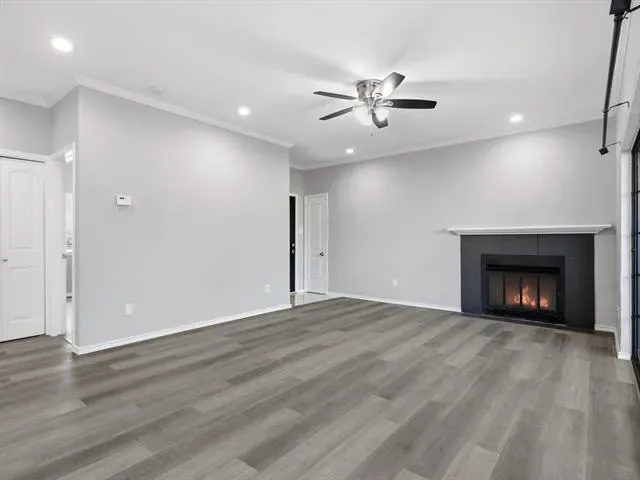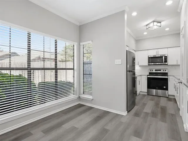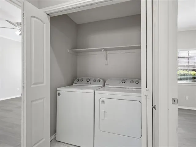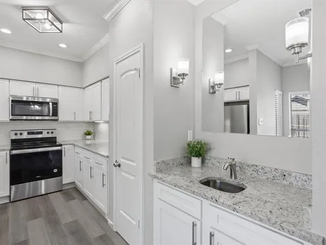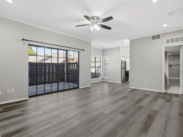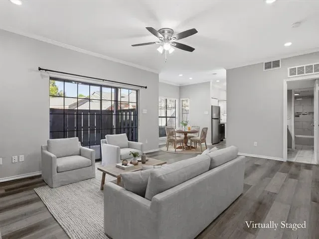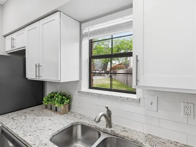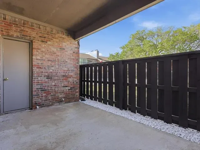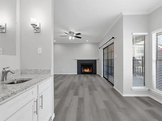 Beautifully updated 2-bedroom, 1-bath, first-floor, corner end-unit condo in a small gated community, offering a desirable location just across from the pool and within walking distance to River Legacy Park. This inviting home features a modern kitchen with granite countertops, under-cabinet lighting, and stainless steel appliances, including a new refrigerator. Luxury vinyl plank flooring and fresh paint extend throughout, complemented by ceiling fans in the living room and bedrooms. The bathroom has a dual-sink vanity with a granite countertop, while the living room includes a wood-burning fireplace and an adjacent wet bar, ideal for a coffee station or casual refreshments. Additional conveniences include a washer and dryer, a walk-in closet in the primary bedroom, a spacious patio with a storage closet, and an assigned covered carport. HOA covers water, trash, and sewer. Ideally located near shopping, dining, and major highways for an easy commute to Dallas or Fort Worth. Book your showing today!