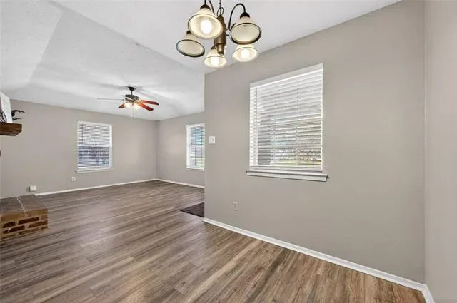 Inside, the living room has great character with a bold blue accent wall, LVP flooring, a wood-burning brick fireplace, and a ceiling fan that helps tie the whole space together. It feels open, inviting, &' easy to furnish, with a natural flow into the dining area &' kitchen. Fresh paint adds a crisp look, while the updated flooring in the main living spaces gives the home a clean &' durable finish for everyday living. New Blinds throughout for added privacy.