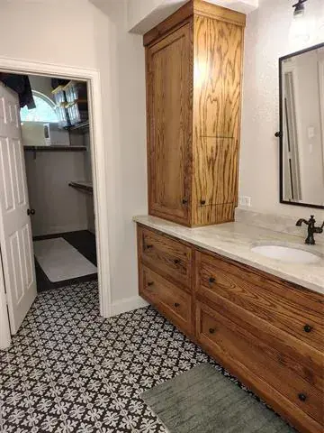The primary suite offers a beautifully updated bath with a tiled shower, custom cabinetry, leathered quartzite countertops, framed mirrors, updated vanity lighting, and porcelain tile flooring extending through the bath, closet, and toilet room. Additional interior highlights include hand-scraped real hardwood floors, custom chandeliers in the entry, wine room, and living area, custom window treatments, and updated paint throughout.