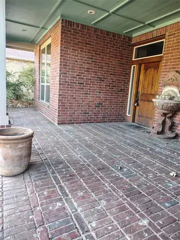Exterior features include a large custom brick front porch with a wall fountain, a lighted porte-cochere, sprinkler system, and beautifully landscaped grounds. The backyard retreat features flagstone walkways, accent lighting, lush landscaping, and a wall fountain—ideal for relaxing or entertaining.