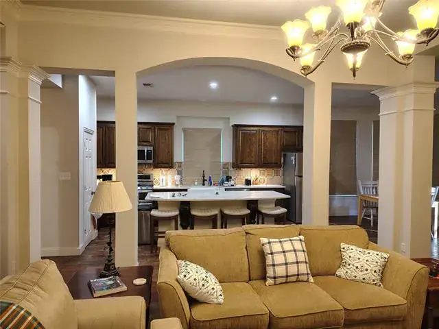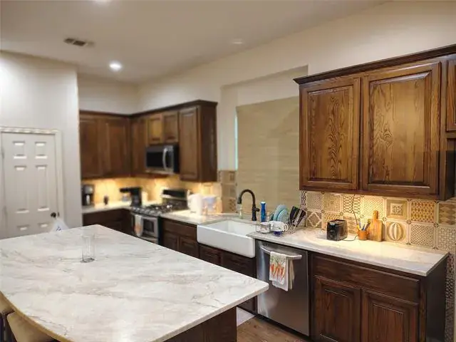 Charming 4-bedroom, 2-bath home located in the heart of Fort Worth, offering comfort, style, and recent updates throughout. The kitchen features leathered quartzite countertops, a Kohler farmhouse sink, Delta faucet, porcelain backsplash, under-cabinet lighting, stainless steel appliances, and a breakfast bar open to the dining area—perfect for everyday living and entertaining.