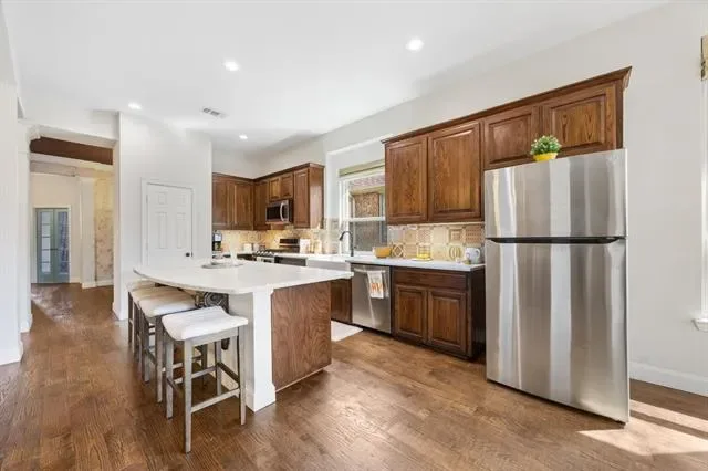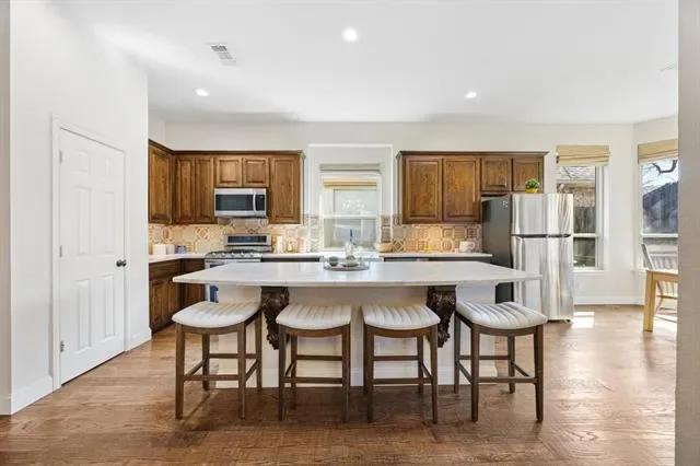 Charming 4-bedroom, 2-bath home located in the heart of Fort Worth, offering comfort, style, and recent updates throughout. The kitchen features leathered quartzite countertops, a Kohler farmhouse sink, Delta faucet, porcelain backsplash, under-cabinet lighting, stainless steel appliances, and a breakfast bar open to the dining area—perfect for everyday living and entertaining.