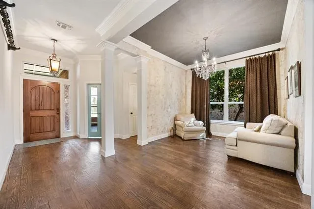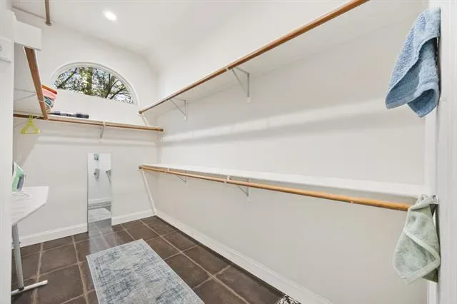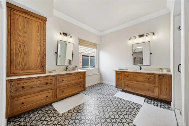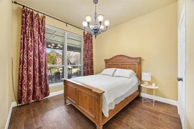The primary suite offers a beautifully updated bath with a tiled shower, custom cabinetry, leathered quartzite countertops, framed mirrors, updated vanity lighting, and porcelain tile flooring extending through the bath, closet, and toilet room. Additional interior highlights include hand-scraped real hardwood floors, custom chandeliers in the entry, wine room, and living area, custom window treatments, and updated paint throughout.