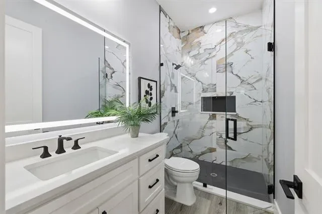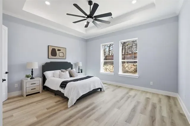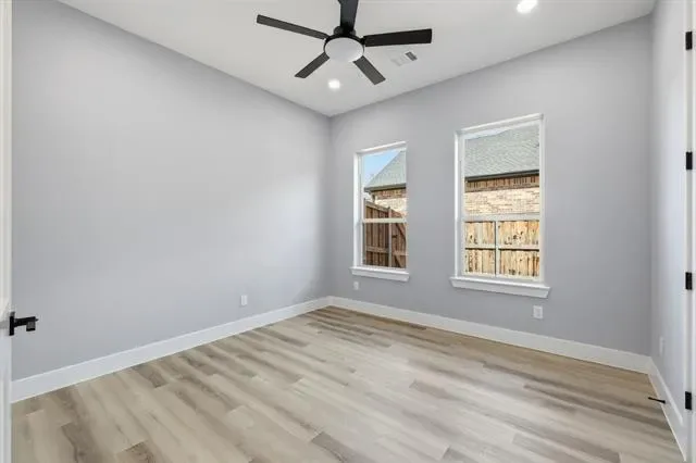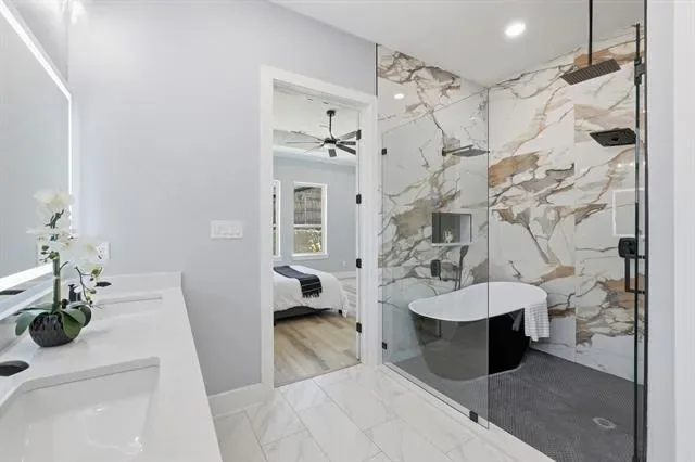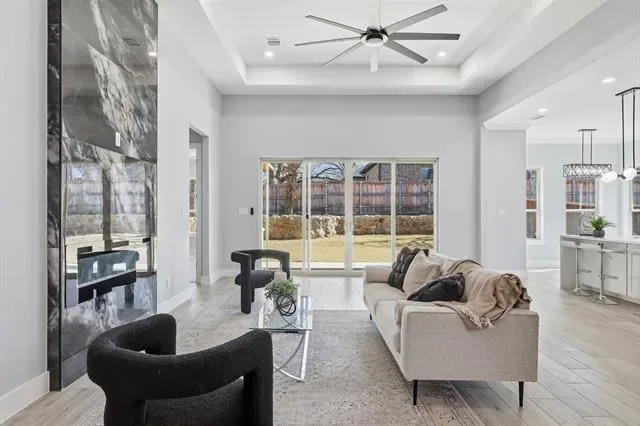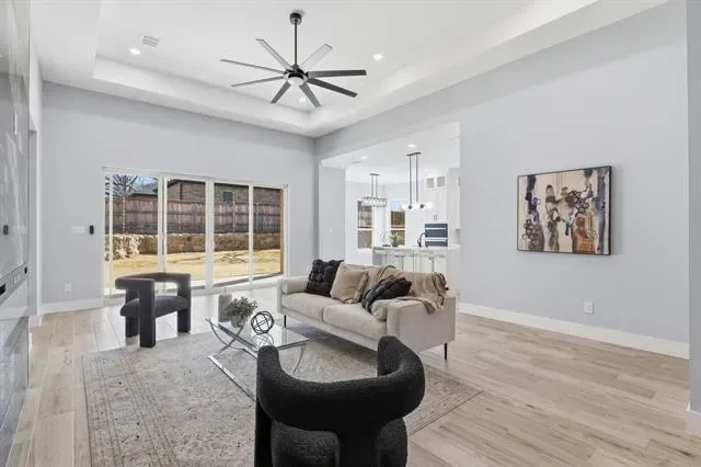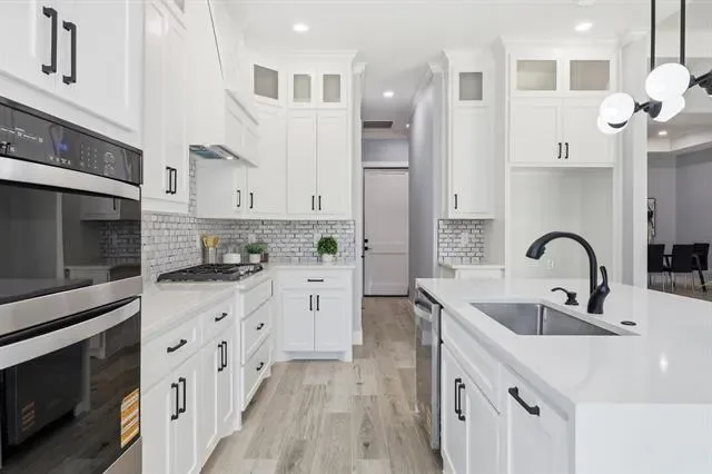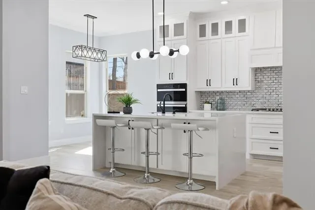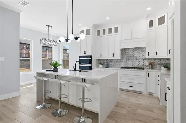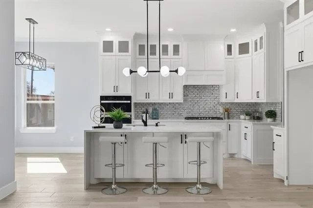 Perfectly positioned in the heart of Arlington, this stunning new construction single-story home offers modern design, thoughtful craftsmanship, and the freedom of no HOA. From the moment you arrive, the striking stone and brick exterior paired with an elegant iron front door sets the tone for the quality found throughout. Step inside to soaring tall ceilings and a bright, open-concept layout designed for both everyday living and effortless entertaining. The living space and kitchen feature durable wood-look ceramic tile flooring, while the bedrooms are finished with stylish luxury vinyl plank for comfort and warmth. The chef’s kitchen is a true centerpiece, showcasing a large island, ceiling-height cabinetry with glass uppers, and high-quality stainless steel appliances. Seamless indoor-outdoor living is made easy with high-end sliding doors that open to an East-facing covered patio, perfectly positioned to enjoy afternoon shade. The spacious backyard is enhanced by beautiful stone retaining walls, offering both visual appeal and usable outdoor space. Privately situated at the back of the home, the primary suite enjoys peaceful backyard views and a spa-inspired bathroom featuring a freestanding tub within the oversized shower and rain shower heads for a truly luxurious retreat. With 4 bedrooms, 2.5 bathrooms, refined finishes, and a prime Arlington location, this home delivers elevated single-story living with style, comfort, and exceptional attention to detail.
