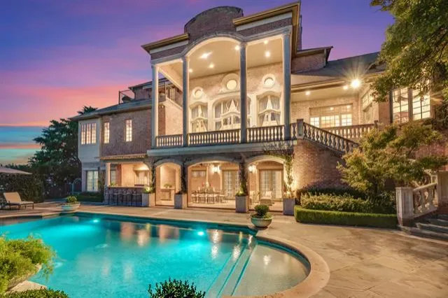 This masterpiece was conceived as a French château, shaped by European architectural influence and designed for lasting comfort. Many of the home’s architectural elements were sourced from Europe and installed first, with the structure designed around them, giving the residence a collected, timeless presence. Set on two wooded acres along the West Fork of the Trinity River, the property offers rare privacy while remaining equidistant to Downtown Dallas and Fort Worth. Winding trails lead to the water’s edge, while the rear of the home overlooks Lake Viridian. The residence spans 9,026 square feet across three levels, with an additional 835 square feet of flexible upper-level space, all served by an elevator. The main living areas are climate controlled by a geothermal system, with traditional HVAC serving the garage and flex space. The main level features a grand entry with Versailles-inspired flooring, sweeping iron staircase, and crystal chandelier. A central parlor opens through imported French château doors to the veranda and is anchored by a Louis XIV limestone fireplace. The formal dining room, wet bar, office with Regency-era fireplace and London post-office doors, chef’s kitchen with a separate catering kitchen, and a private primary suite with dual baths and custom closets complete the main floor. The pool level includes a full kitchen, wine cellar, game or studio space, laundry, and direct access to the resort-style terrace. The upper level offers three bedrooms, two baths, catwalk views, and a balcony suite overlooking the estate. A rare blend of European architecture, privacy, and location in the heart of North Texas.