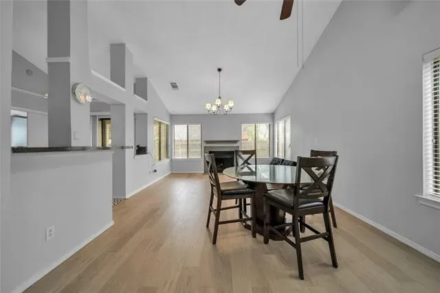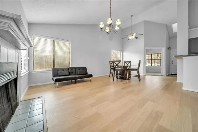 Step inside to an inviting open living area featuring soaring vaulted ceilings, a cozy wood-burning fireplace, and an abundance of natural light that fills every corner. The durable laminate and tile flooring throughout the common areas adds both elegance and easy maintenance. The well-appointed kitchen boasts a spacious pantry and sleek stainless steel electric appliances, perfect for everyday cooking and entertaining alike.