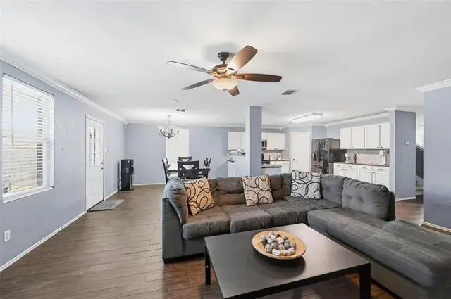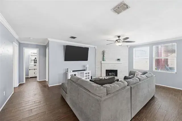This spacious 3,700 sq ft home offers a bright, open layout and tasteful modern updates throughout. Enjoy fresh custom interior paint, updated flooring, and an inviting living area centered around a white-stone fireplace with crown molding and natural light.