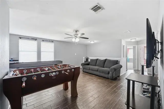 The remodeled kitchen features new granite countertops, a sleek glass tile backsplash, painted cabinetry, and updated appliances, all flowing seamlessly into the dining and living spaces—perfect for entertaining. The downstairs guest suite and full bath offer flexibility for visitors or a home office. Upstairs, the expansive primary retreat includes dual walk-in closets, a private study, and a completely renovated spa-style bath with an oversized custom-built shower featuring jet body sprayers and elegant tile finishes. The secondary bedrooms are spacious and complemented by a large game room ideal for media, exercise, or play.