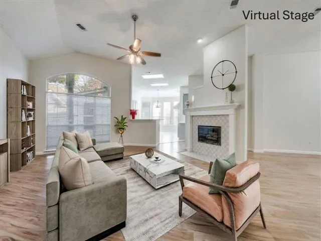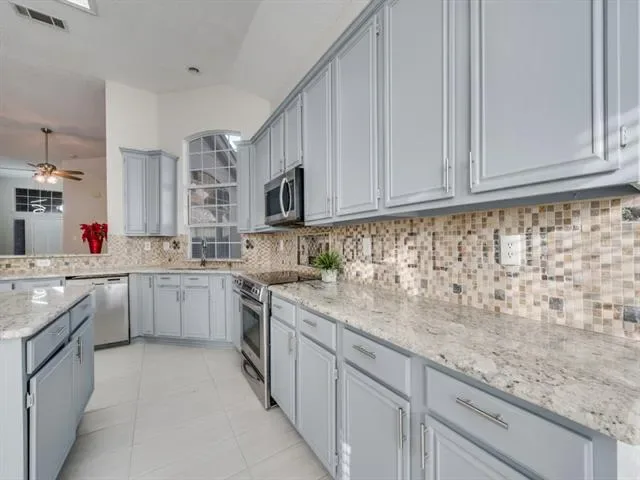 Wow! Discover the perfect blend of style and functionality in this beautiful 3 bedrooms 3 full bath home, boasting an impressive, bonus sunroom that adds over 300 sqft of living space not reflected in tax records and ideal for entertainment; Upon entering, you will be greeted with tall 12 ft ceilings in the foyer and an open spacious layout, making this one of the most popular floorplan in this Highland Home build subdivision; Expansive windows provide an abundance of natural light while new flooring, light fixtures, fresh paint enhance the ambiance; The spacious kitchen designed with entertaining in mind features an island, granite countertops, loads of cabinets and stainless steel appliances; The second living room can serve as an office area or kid’s playroom with its own third bathroom. Two bathrooms are upgraded with quartz countertops and primary bath includes a separate shower and garden tub; Additional features include a 2 car oversized garage with extended storage space; The exterior offers a large covered porch, sprinkler system and a backyard with fruit trees, as well as a large storage shed; Don’t miss the opportunity to own this beautiful home with NO HOA to worry about