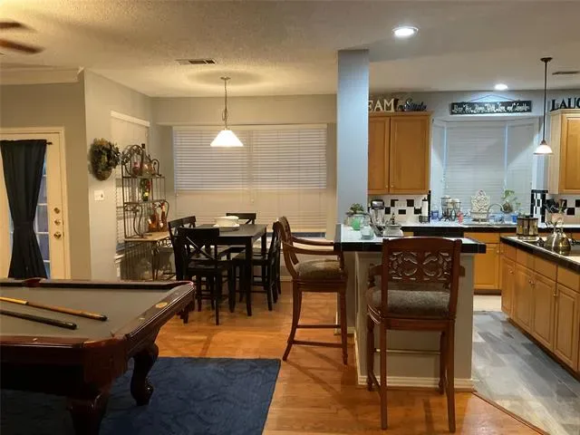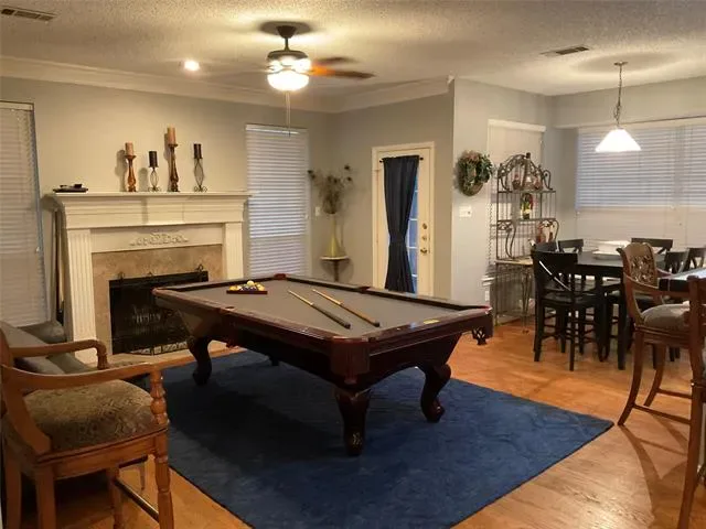 Beautiful family fun home with 2 living areas down, gas fireplace, master bedroom, with a bedroom or office downstairs. Upstairs features a third bedroom with gas fireplace, a fourth bedroom with attached bonus room for a study, play room or nursery, plus a third living area with a bar sink overlooking the downstairs. Open concept design with high ceilings, breakfast and formal dining areas. Floors are wood tile and carpet. The kitchen designed for everyday comfort with a cooktop island, built-in microwave, and lots of counter space. Car enthusiasts will love the 2-car attached garage with a walk-in attic above and second 2-car garage with oil pit, attic, AC, and driveway parking for several more cars. Pet-friendly yard with retractable awning adjoins fenced storage area with shed behind detached garage. Move-in ready with fresh interior paint and fixtures. Close to I-30 and 360 interchange and Entertainment District with AT&T Stadium, Globe Life Park, Six Flags, Hurricane Harbor, and Texas Live!. Enjoy walking the neighborhood loop and perhaps hike to the Entertainment District on cool summer nights. This could be your dream home in an ideal location!