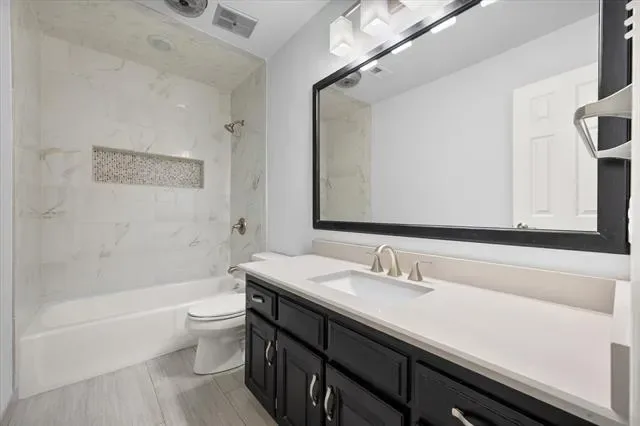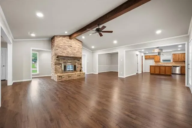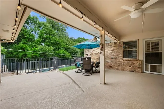 Beautiful 4-bedroom, 2.5-bath home with rear-entry garage and sparkling inground pool located in the popular Huntwick Addition! Wood-look laminate floors welcome you at the entry and flow throughout most of the home. The spacious living area features a vaulted ceiling, ceiling fan, wood-burning fireplace with gas starter, and lovely views of the backyard and pool. Formal dining is open to the living area and offers flexibility for a second sitting area, home office, playroom, or dining space with convenient access to the kitchen. The kitchen and breakfast area are also open to the living room and feature abundant cabinetry, generous counter space, and a gas cooktop. Utility room off the kitchen includes built-in cabinets and space for a freezer. The home offers a desirable three-way split bedroom arrangement. The private primary suite is located at the back of the home with access to the covered patio. The ensuite bath has been beautifully updated with marble countertops, white cabinetry, soaking tub, oversized separate shower, and two walk-in closets with pocket doors. The fourth bedroom is split from the others and includes an ensuite half bath—ideal for a home office or second living space. Two additional secondary bedrooms share a fully updated hall bath. Enjoy the backyard oasis featuring a covered patio with ceiling fan overlooking the fenced pool area for added safety, plus a tree-lined back yard perfect for pets or play. Recent upgrades include: Low-E vinyl windows' Trane 18-SEER, 4-ton HVAC (installed August 2024 with remaining warranties)' Class 4 roof (October 2025)' wood laminate flooring (December 2024)' pool replastered (March 2024)' pool equipment replaced and replumbed (November 2019). Well-maintained and ready for a new owner! Don''t miss this great opportunity!