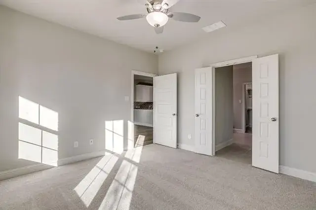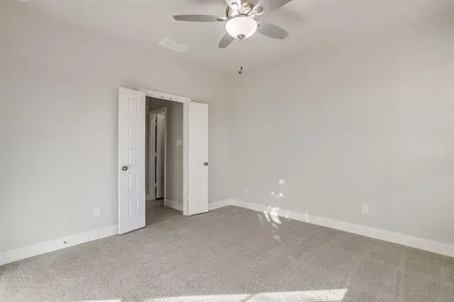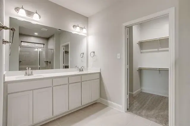 Tucked away on the first floor, the private primary suite serves as a tranquil retreat, complete with a dual vanity, elegant 12×24 tile accents, a large glass-enclosed shower, and a generous walk-in closet.