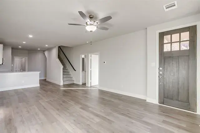 Welcome to this beautifully crafted townhome in Knight’s Landing on Eden Rd., where contemporary comfort meets everyday convenience. From the moment you arrive, the classic brick-and-stone façade, striking 8-foot Craftsman-style front door, and rear-entry two-car garage set the tone for timeless curb appeal.